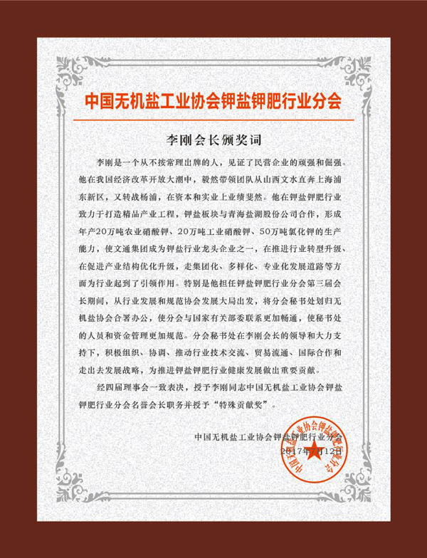 2017年7月12日至14日,中國無機(jī)鹽工業(yè)協(xié)會(huì)鉀鹽鉀肥行業(yè)分會(huì)第四次會(huì)員大會(huì)暨2017鉀鹽鉀肥產(chǎn)業(yè)技術(shù)交流大會(huì)山東省青島市青島花園大酒店召開。會(huì)上,為表示對李剛會(huì)長在推進(jìn)鉀鹽鉀肥行業(yè)健康發(fā)展以及李剛會(huì)長擔(dān)任鉀鹽鉀肥行業(yè)分會(huì)第三屆會(huì)長期間所做出重要貢獻(xiàn)的肯定與褒獎(jiǎng),經(jīng)中國無機(jī)鹽工業(yè)協(xié)會(huì)鉀鹽鉀肥行業(yè)分會(huì)第四屆理事會(huì)一致表決,授予李剛會(huì)長中國無機(jī)鹽工業(yè)協(xié)會(huì)鉀鹽鉀肥行業(yè)分會(huì)名譽(yù)會(huì)長職務(wù)并授予“特殊貢獻(xiàn)獎(jiǎng)”。